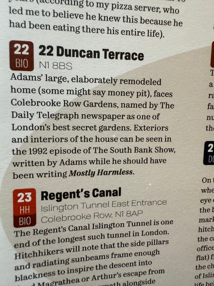 22 Duncan Terrace in Islington was Douglas Adams’ home during the height of *The Hitchhiker’s Guide to the Galaxy*’s success. He moved here in the early 1980s, after the series had become a cultural phenomenon, and it remains the address most closely associated with his London years of fame and creative expansion.