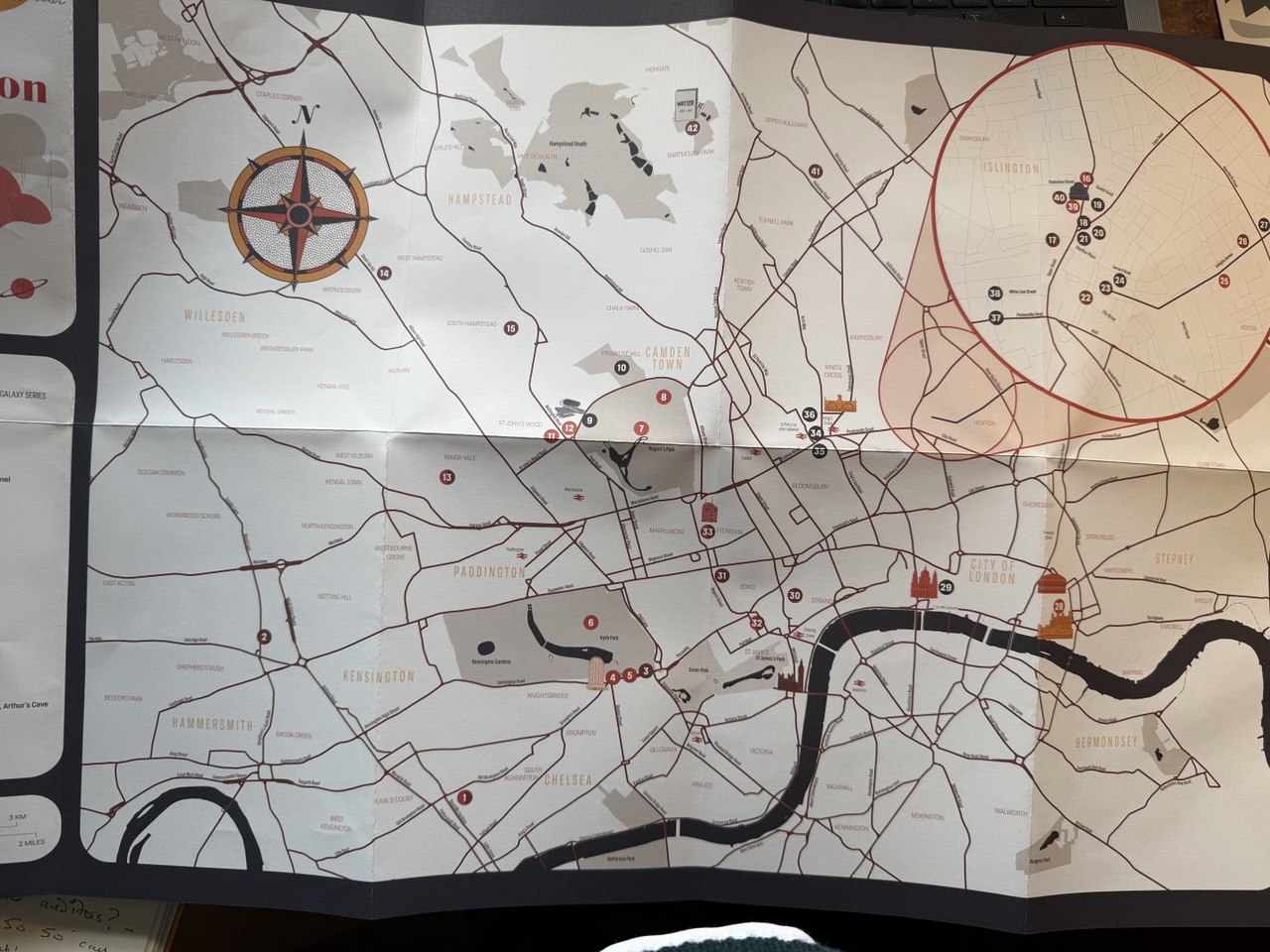 1. 42 Redcliffe Square 2. Bush Theatre 3. The Berkeley 4. Park Tower Hotel 5. Harrods 6. Hyde Park 7. Regent’s Park 8. London Zoo 9. Kate’s Corner of the Park 10. Primrose Hill 11. Lord’s Cricket Ground 12. Krikkit Warship 13. BBC Maida Vale Studios 14. 88c Fordwych Road 15. 98 Greencroft Gardens 16. Hotblack Desiato 17. 42 Upper Street 18. Islington Green 19. Collins’ Music Hall 20. Camden Passage 21. Pizza Express 22. 22 Duncan Terrace 23. Regent’s Canal Islington Tunnel 24. Noel Road 25. Poppy The Canal Boat 26. 29 Arlington Avenue 27. Fringes of South Hackney